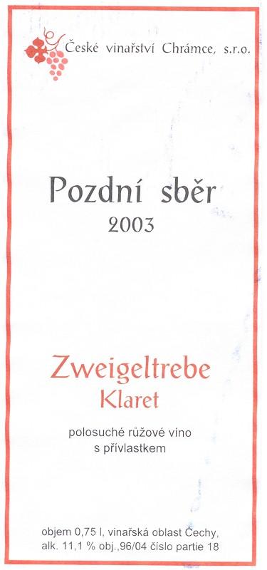 Zweigeltrebe 2003 pozdní sběr (rosé klaret) - České vinařství Chrámce s.r.o.