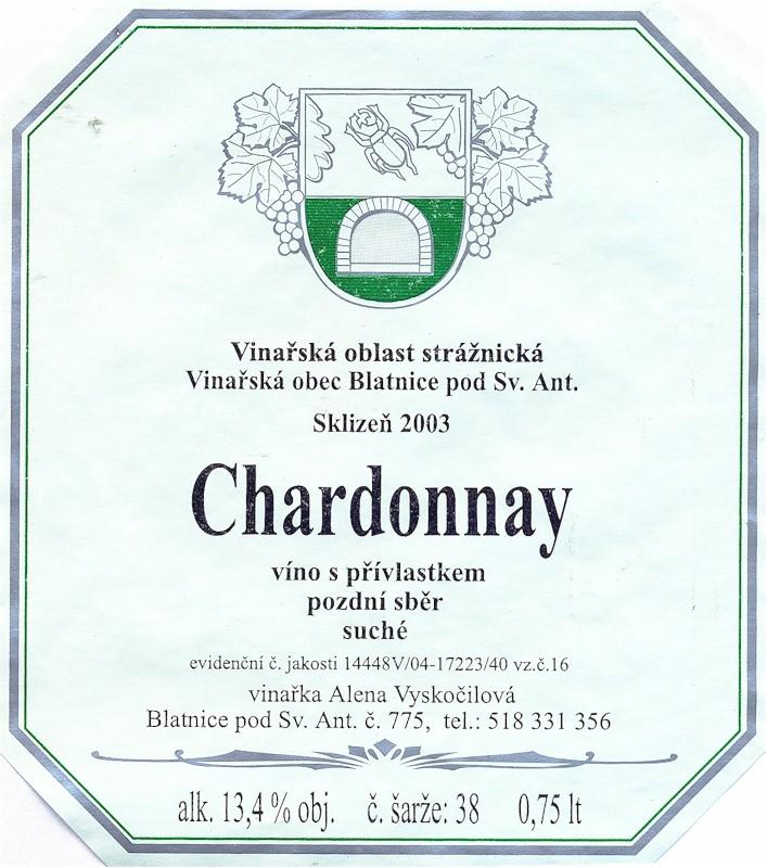 Odrůda: ChardonnayRočník: 2003Jakost: pozdní sběrCukernatost: suchéVinařská oblast: StrážnickáVinařská obec: Blatnice pod Sv. AntoníkemViniční trať: Stará hora, FloriánkyVýrobce: Vinařství Vyskočil Stanislav a Alena Vyskočilová Blatnice pod Sv. AntonínkemAlkohol: 13,4 % obj.Obsah zbytkového cukru: 1,8 g/lObsah kyselin: 5,5 g/lČíslo šarže: 38Evidenční číslo jakosti: 14448V/04-17223/40Číslo vzorku: 16Cena: 85,- Kč (přímo od výrobce duben 2005)