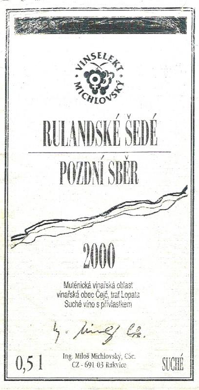 Jen tak brouzdám internetem zkoumajíc stránky větších i menších výrobců vína, až jsem narazil na odkaz pana Michlovského, jehož osobnost už asi nezůstala nikomu z vínomilů utajena. Pan Michlovský platí za jednu z největších kapacit v naší malé vinařské zemi a je také znám uplatňováním moderních technologií. Jeho nabídka vín je opravdu široká a při jejím procházení mne doslova přepadla vzpomínka na nedávné ochutnání lahve Sauvignon Blanc 2000 pozdní sběr z Michlovského řady Chateau Dowina. Nebudu Vás dlouho napínat, víno skončilo ve výlevce a to i přesto, že se dostalo do Salonu vín ČR. A byl to docela trapas, protože se láhev otevřela ve společnosti více lidí, holdujících vínu. Ale dost! Teď ochutnám láhev Rulandské šedé 2000 pozdní sběr, která snad napraví z mého pohledu panu Michlovskému reputaci.Čím je láhev zajímavá? Krom slušivé nálepky Salon vín 2002/2003 je to určitě metoda Sur lie, která byla při výrobě použita. Spočívá v dlouhodobém ležení vína na kvasnicích a pravidelném ručním promíchávání. Podrobnosti naleznete v naší Encyklopedií v položce Kategorizace. Rulandské šedé je velmi extraktivní odrůda, tak mne trochu zarazila pouze průměrná hodnota bezcukernatého extraktu 19,3 g/l. Ostatní Rulandy šedé z katalogu jí v tomto ohledu překonaly. Po dalším zkoumání katalogu Salonu vín ČR jsem si všimnul že pan Michlovský, při svém obrovském zastoupení, má jen relativně menší hodnoty extraktu. Samozřejmě záleží na přívlastku a odrůdě, ale i tak je to myslím zajímavý poznatek, který ovšem o kvalitě vín nevypovídá nic zásadního.Láhev typu Bordolese má objem 0,5 l (tmavé sklo) a je opatřena plným korkem délky 45 mm. Adjustáž je povedená, jak se už stalo dobrým zvykem vín pana Michlovského. Prostřednictvím etikety je nám sděleno vlastně všechno potřebné. Ocenil bych údaje o zbytkovém cukru a kyselinách, nevidím jediný důvod, proč by měli být lidé holdující vínu o tyto hodnoty ochuzeni. Dovolím si tedy 2 bodíky v hodnocení srazit. Barva je zlatavá s hnědým podtónem, pěkná ale pochmurná. Trošku mi chyběla výraznější jiskra, slušné hodnocení si však zaslouží. Viskozita průměrná, víno mizelo ze stěn až příliš rychle. V tomto ohledu mne víno zklamalo hlavně v tom smyslu, že už to většinou něco napovídá o chuti, ale nepředbíhejme. Vůně mne naopak přímo ohromila. Ze začátku se projevovaly vyzrálé hrozny až rozinky, byl tam také nádech medu a citrusových plodů. Okamžitě mi to připomnělo nedávný zážitek z Rulandy bílé 2004 bobulový výběr, botrytický sběr. Později a hlavně na druhý den vůně působila unaveněji a ozvala se lehká stařinka. I přesto dávám vysoké hodnocení.Chuť je bohužel docela velké zklamání. Víno ke mně promlouvalo odněkud z dálky a nenechalo mé chuťové buňky na pochybách, že už je nějakou dobu za vrcholem. Je to jako poslouchat rádio se špatným signálem. Rulandské šedé působí za mlada hutně a široce, jako snad žádná jiná odrůda. Toto víno tu chuť pouze připomene a než se nadáte, zmizí v nenávratnu. Svěží kyselinky, tolik charakteristické pro naše bílá vína, se stářím vytratily a víno působilo mdle. Hlavně proto každé mé další napití předcházela spíše víra v zázračné nadýchnutí vína než chuť na víno jako takové.Vhodné požití tohoto stářím poznamenaného vzorku bych viděl při přivření obou očí jako aperitiv před jídlem hlavně pro jeho opojnou vůni. Nebo pijte víno s pokrmem a než si vaší hosté uvědomí, že je docela vodnaté bude 0,5 litrová láhev pryč a zbude dojem z nadprůměrné vůně. A k jakému jídlu? Tady bych souhlasil s výrobcem a uvedl pokrmy z kuřecího masa jako např. kuřecí špíz nebo salát. U sýrů dbejte na jejich jemnost, aby nepřebily dosti unavené víno.