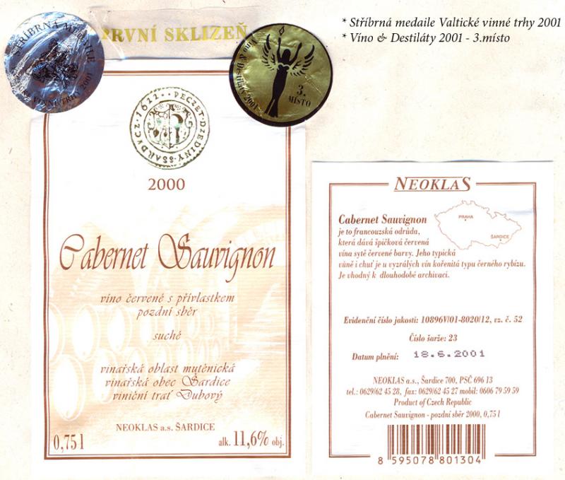 Cabernet Sauvignon 2000 pozdní sběr (panenská sklizeň) - Neoklas a.s., Šardice