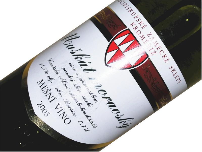 Odrůda: Muškát moravskýRočník: 2003Jakost: pozdní sběrKategorizace: mešníCukernatost: suchéVinařská oblast: Uhersko-hradišťskáVinařská obec: BoršiceViniční trať: neuvedenoVýrobce: Arcibiskupské zámecké víno s.r.o. KroměřížČíslo šarže: 44Evidenční číslo jakosti: 7671V/04-7223/15Datum lahvování: VI./2004Alkohol: 11,9 % obj.Cena: 140,- Kč (Prodejna Arcibiskupských zámeckých sklepů Kroměříž 2004)