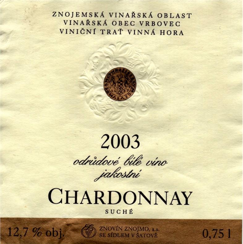 Odrůda: ChardonnayRočník: 2003Jakost: odrůdové jakostníObsah zbytkového cukru: suchéVinařská oblast: ZnojemskáVinařská obec: VrbovecViniční trať: Vinná horaVýrobce: Znovín Znojmo a.s.Číslo šarže: 206Rok lahvování: 2004Alkohol: 12,7 % obj.Zbytkový cukr: 3,7 g/lKyseliny: 6,9 g/l (!)Bezcukerný extrakt: 26,8 (!)Cena: 99.- Kč (Český archiv vín, Praha-Radotín) 90,- Kč přes Zásilkovou službu
