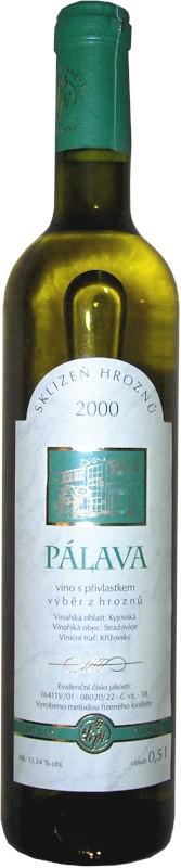Shrnutí údajů o dnešním víně:Odrůda: PálavaRočník: 2000Jakost: výběr z hroznůZatřídění dle zbytkového cukru: suchéVinařská oblast: KyjovskáVinařská obec: StrážoviceViniční trať: KřižovskýVýrobce: LIVI s.r.o. DubňanyEvidenční číslo jakosti: 08020V/22Číslo vzorku: 38Alkohol: 13,34 % obj.Obsah zbytkového cukru: 2,9 g/lObsah kyselin: 5,8 g/lBezcukerný extrakt: 26,4 g/lDatum sklizně: 29.9.2000Cukernatost moštu: 24,4 °NMCena: 162,- Kč (vinotéka Velké Bílovice srpen 2002)