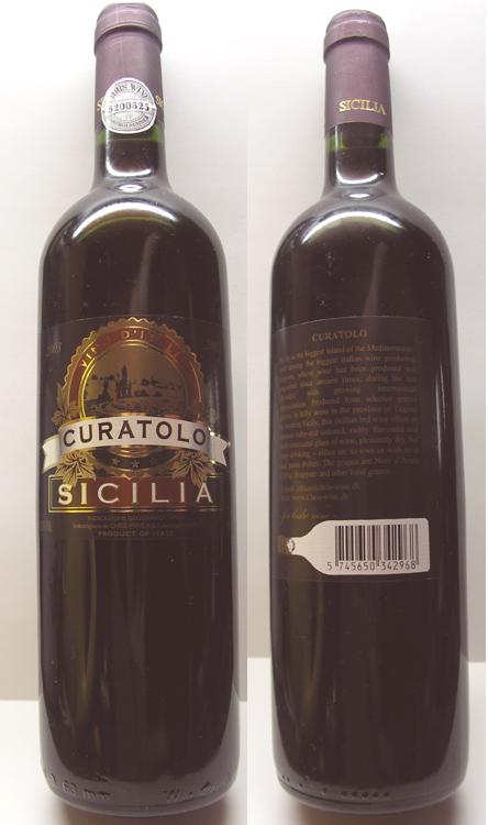Shrnutí údajů o dnešním víně:Obchodní název: CuratoloOdrůda: Nero d´Avola (50 %), zbytek Frappato a další lokální odrůdyRočník: 2003Jakost: Indicazione Geografica Tipica (IGT)Obsah zbytkového cukru: suchéVinařská oblast: SicílieVinařská podoblast: TrapaniAlkohol: 12,5 %Teplota skladování: okolo 10° CTeplota podávání: 16 - 18° CCena: 4,90 € - Duty Free Shop na letišti v Dánsku, prosinec 2005