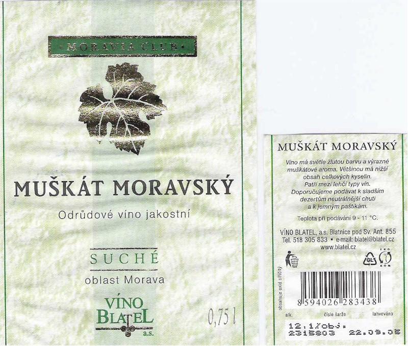 Shrnutí údajů o dnešním víně:Odrůda: Muškát moravskýRočník: 2004Jakost: odrůdové jakostníZbytkový cukr: suchéVinařská oblast: MoravaVinařská podoblast: SlováckáVýrobce: Víno Blatel a.s., Blatnice pod Svatým Antonínkem 855, 696 71Číslo šarže: 2315803 Alkohol: 12,1% obj.Teplota skladování: 6 - 12º CTeplota podávání: 9 - 11º CDoporučená archivace: doporučuje se pít mladéCena: 58,- Kč (přímo do výrobce 2005) 54,- Kč (obchod s víny Město Albrechtice)