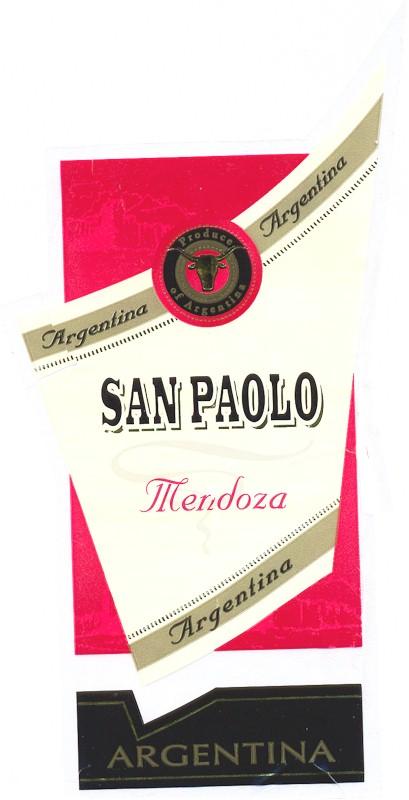 Obchodní název: San PaoloOdrůda: Syrah x Cabernet SauvignonRočník: 2002Jakost: Vino FinoCukernatost: suchéVinařská oblast: MendozaČíslo šarže: 2635E09Alkohol: 13 % obj.Teplota podávání: 15 - 17° CDovozce: United Brands s.r.o.Cena: 89,- Kč (Globus v roce 2003)