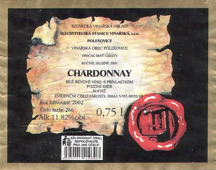 Shrnutí údajů o dnešním víně:Odrůda: ChardonnayRočník: 2001Rok lahvování: 2002Jakost: pozdní sběrZbytkový cukr: suchéVinařská oblast: BzeneckáVinařská obec: PolešoviceViniční trať: GrejtyVýrobce: Šlechtitelská stanice vinařská, s.r.o. PolešoviceČíslo šarže: 266Evidenční číslo jakosti: 30663 V/02-8020/68Teplota podávání: 10 - 12º CAlkohol: 11,82 % obj.Cena: neznáma - dar