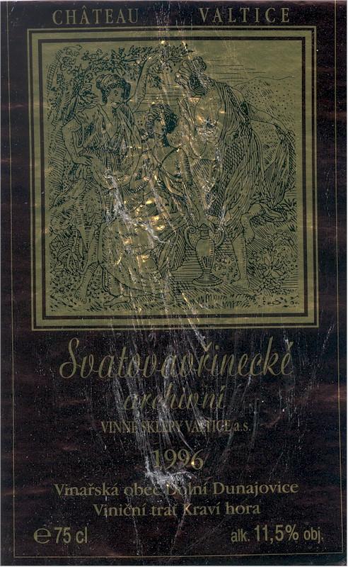 Odrůda: SvatovavřineckéRočník: 1996Jakost: archivníCukernatost: suchéVinařská oblast: MikulovskáVinařská obec: Dolní DunajoviceViniční trať: Kraví horaVýrobce: Vinné sklepy Valtice, a.s.Alkohol: 11,5 % obj.Číslo šarže: 81/97Obsah zbytkového cukru g/l: 3,6Obsah kyselin g/l: 5,9Bezcukernatý extrakt g/l: 20,2Teplota skladování: 6 - 13° CTeplota podávání: 14 - 18° CCena: 140,- Kč (akční cena Hypernova v roce 2003)