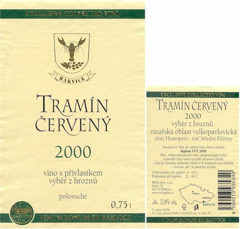 Shrnutí údajů o dnešním víně:Odrůda: Tramín červenýRočník: 2000Jakost: výběr z hroznůZatřídění dle zbytkového cukru: polosuchéVinařská oblast: VelkopavlovickáVinařská obec: HustopečeViniční trať: Střední RůženyVýrobce: Réva Rakvice s.r.o., Dolní 32, 691 03 RakviceČíslo šarže: 01358Evidenční číslo jakosti: 25682V/01-8020/32Číslo vzorku 45Alkohol: 11,6 % obj.Obsah zbytkového cukru: 6,9 g/lObsah kyselin: 4,8 g/lBezcukerný extrakt: 21,3 g/lTeplota skladování: 8 - 10 °CTeplota podávání: 12 - 14 °COcenění: Diplom Valtické vinné trhy 2001Cena: 185,- Kč (přímo od výrobce v srpnu 2003)