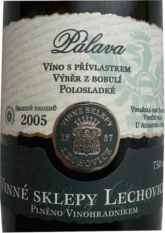 O Pálavě z Vinných sklepů Lechovice jsem toho už lecos slyšel, speciálně o tomto výběru z bobulí 2005 (obec Borotice - trať U Auerova kříže) taky. Od nákupu pro takto vysoký přívlastek atypické láhve o objemu 0,75 l mě pak neodradila ani cena. Riskoval jsem a byl to zisk, ale popořádku dle jistých zvyklostí.Adjustáž se snaží být něčím jiným, než je klasická lechovická řada. Jistým způsobem se jí to daří, navozuje pocit něčeho “jiného”, z praktického hlediska, kdy je pro mě ideálem klasický “válec”, mě moc neuchvacuje. Faktem zůstává nápaditost, částečná originalita a přehlednost. Korek je celistvý, zároveň je i dost krátký, určitě však dostačující.Barva odpovídá vysokému neodfláknutému predikátu, nádherné zlato, pastva pro oči. Víno je bez jakýchkoliv nečistot a je čiré.Vůně se tváří vznešeně, je odrůdově typická, intenzivní, čistá a lákavá. Fajnšmekr v ní jistě najde to co hledá, tuším pak, že ještě mnohem víc. Rozepsat co všechno se nachází v chuti, kolik ovoce, kolik květin, to by zabralo několik stránek papíru A4. Je zde tak neskutečně široká paleta všech možných chuťových barev, že je to až k nevíře. Zbytkový cukr kolem 43 g/l a párádní kyselina a vcelku vysoký alkohol tvoří nebeskou strukturu. Dochuť je nekončící, mazlivá, medová...V tomto víně se těžko hledá chyba a nikoho ani nenapadne jí hledat. Od samého začátku do konce si mě získalo. Ano, právě vyhrálo konkurs a v zimě bude stát na vánočním stole. Další z kousků, nad kterým by se cizinci nestačili divit...