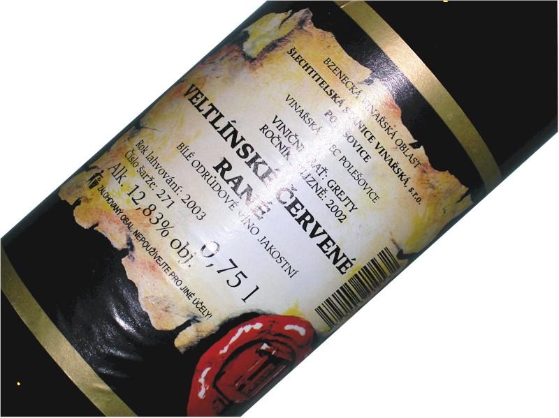 Odrůda: Veltlínské červené ranéRočník: 2002Jakost: odrůdové jakostníCukernatost: suchéVinařská oblast: BzeneckáVinařská obec: PolešoviceViniční trať: GrejtyVýrobce: Šlechtitelská stanice vinařská, s.r.o. PolešoviceČíslo šarže: 271Rok lahvování: 2003Alkohol: 12,38 % obj.Cena: 45,- Kč (přímo od výrobce v roce 2003)