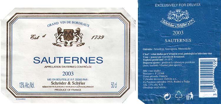 Shrnutí údajů o dnešním víně:Obchodní název: SauternesOdrůda: Sémillon x Sauvignon x Muscadelle (poměr neurčen)Ročník: 2003Jakost: Appellation Sauternes Contrôlée (AOC)Obsah zbytkového cukru: sladkéVinařská oblast: BordeauxVinařská podoblast: SauternesVýrobce: Maison Schröder & Schüler, FrancieAlkohol: 13 % obj.Obsah:0,5 LCena: 250,- Kč (Delvita červen 2006)