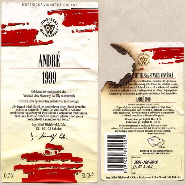 Mutěnická oblast, obec Hovorany, trať Díly za vinohrady, alkohol 11,4 %. Suché. Lahvováno patrně 2001.To se nám to pije na Valentýnka, když máte s kým :-)...Tak jo, víno jsem dostal jako dárešek a díky jeho stáří 4,5 roku si slibuji příjemný zážitek. Pan Michlovský je uznávaným Panem Vinařem a proto jsem dnešní zamilovaný večer vsadil na víno z jeho sklepů. K obchodní politice p.Michlovského sice připomínky mám, ale jeho vína, která se ke mně dostanou povětšinou pouze jako dárky, tak jeho vína mívají povětšinou velmi slušný standard.Viněta mne mimo jiné informuje, že: „...Hrozny byly zpracovány reduktivní technologií... ...Květnatá vůně fialek je podpořena tóny plodů černého rybízu a borůvek. V chuti je víno svěží, s bohatou strukturou, vyváženými kyselinami a originální tříslovinou. Zráním v láhvi je ovocnost lesních plodů obohacena kořenitostí a mandlovými tóny... ...Svým charakterem a kvalitním korkem je víno určeno jak k okamžitému stolování, tak i k uchování v archívu, kdy nejlepší lahvové zralosti dosáhne po 2 až 3 letech..." A ještě rada, abych si k tomuto vínu udělal např. "...filety z argentinské svíčkové s omáčkou z tříbarevného pepře..."No, možná příště.Nevím teda, jak to myslel s tou zátkou, já jsem vytáhl obyčejný lisovaný špunt délky 38 mm s celokorkovými lemy, ale budiž. A až na ty fialky musím uznat, že víno je na vinětě popsáno pravdivě a dobře a dobré je také samo o sobě. Máte-li rádi zvláštní, jako by temnou příchuť odrůdy André jako já, neváhejte. Velmi se vyplatí láhev otevřít nejméně 30 minut před konzumací a víno naladit na správnou teplotu - jinak Vám unikne spousta jeho předností. Vím, že tenhle výborný André se dá koupit např. v Hypernově za 145,- Kč, ale pozor - v regálech podobných typů obchodů najdete stojící láhve ( chudáci ) různých ročníků za jednu cenu - místní nákupčí "odporníci" nerozlišují takovou drobnost, jako je ročník sklizně. Proto se vyplatí zavrtat se hlouběji, třeba najdete ročník 1999 nebo... kdo ví ?A nakonec "bonus" - dohru, malý horor, který mne potkal při pokusu odlepit samolepící "neodlepitelnou" vinětu...
