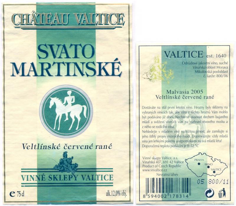 Letošní sklizeň ještě neskončila a už probíhaly debaty, jaký že byl ročník 2006. Osobně jsem se u vinařů setkal s pozitivním hodnocením, občas přecházejícím až do superlativů. Zima 2005/2006 skončila letos hodně pozdě a k vinicím byla poměrně krutá, ovšem dlouhý suchý a teplý podzim hroznům naopak prospěl. Nejlepším způsobem, jak zjistit kvalitu letošních vín, je tato vína ochutnat a to co nejdřív :-)Proč vlastně pijeme nová vína na Svatého Martina? Jde o tradici pěstitelů vín, starou zhruba pět set let, tedy od časů, z nichž máme písemné zprávy. V porovnání s touto historií je psychóza kolem francouzského „božolé“ úplným kojencem, nicméně dobře marketingově zvládnutým. Jak vloni uvedly Vinařské-noviny.cz, pro lidi zaměstnané ve vinařství znamenal tento svátek den, kdy se hradil nájem, kdy vypršely pracovní smlouvy pro sezónní dělníky a učně a kdy se vinař vyrovnával se sběrači. V tento den vinaři nabízeli plody své sklizně a tradičně také ochutnávku mladého vína: ta se nazývala martinská, zatímco lahvování mladého vína zase martinování.Ke svátku Sv. Martina neodmyslitelně patřila dobře vykrmená upečená - "Martinská husa", i když tento zvyk pochází hlavně ze Slovenska. Původ spojitosti mezi svatým Martinem a husou můžeme nalézt ve dvou legendách. Ta prvá praví, že husy svatého Martina při kázání tolik rušily, že nyní pykají na svatomartinském pekáči. Druhá legenda praví, že se svatý Martin před svou volbou biskupem ze skromnosti skrýval v husníku, ale husy ho svým kdákáním prozradily. Kdo měl někdy "možnost" strávit s husami nějaký čas, ten ví o co jde. Husy jsou totiž pánem dvorku, proženou a postaví do latě nejen kohouty, ale i kachny a větší krůty a tvrdě vyjedou i po kočce, středně velkých psech, kozách a nezastaví se ani před člověkem :-)Letošní Svatomartinský magický okamžik dne 11.11. v 11:11 hod. většinou obchodníci dodrželi (až např. na Makro - zde se nová vína prodávala již od 8.11.2006) a v řadě vinoték a restaurací probíhalo křtění a především ochutnávání prvních letošních vín. Pod značkou „Svatomartinské“ se mohou prodávat pouze:- vína bílá z odrůd Müller-Thurgau, nebo Veltlínské červené rané - má jít o vína příjemná, vyrovnaná a svěže ovocitá- vína červená z odrůd Modrý Portugal, nebo Svatovavřinecké - zde má jít o vína hladká sametová, s vyrovnaným obsahem kyselin- vína růžová z odrůd Modrý Portugal, nebo Svatovavřinecké - dobře pitelná, růžová ovocitá vínaKaždý zmíněný typ může být vyráběn z uvedených odrůd - buď jako samostatné odrůdy, nebo jako cuvée z těchto odrůd. Proč byly zvoleny právě tyto odrůdy? Prostě proto, aby jejichž hrozny v potřebném čase dozrály, mohly být zpracovány a vína z nich k 11.11. mohla být vůbec připravena. Tato čerstvá vína nejsou určena pro další archivaci, měli bychom se potěšit z jejich svěžesti a dovádivé divokosti a vypít je tak zhruba do měsíce po lahvování.Letošní Svatomartinská vínaZ původně přihlášených celkem 107 vín, udělila odborná komise (pod záštitou Vinařského fondu, majitele ochranné známky "Svatomartinské víno") právo tuto značku používat dohromady 92 vínům z 54 firem (bylo by zajímavé a super, kdyby se mi podařilo shromáždit etikety všech těchto vín :-) ...!) Dohromady bylo vyrobeno na 350.000 lahví. Těch 15 vzorků, které neprošly smyslovým hodnocením (šlo i o vína velkých a známých firem), má smůlu. Jako nejčastější důvody pro neudělení značky Svatomartinské víno byly uváděny tyto: nečisté a neharmonické tóny, myšina, varné tóny, oxidace, sirka apod.Složení Svatomartinských vín 2006 je takovéto:- Müller Thurgau - 38x- Veltlínské červené rané - 8x- Svatovavřinecké - 28x- Modrý Portugal - 30x- cuvée SV + MP - 3xProcentuální poměr bílých značek k červeným má tak letos (možná trochu překvapivě) hodnotu 43 % ÷ 57 % ve prospěch vín červených.Nejpilnějším "kanónem" se letos stala ZVOS Hustopeče, a.s., která má v nabídce 4 Svatomartinské značky: Müller-Thurgau, Veltlínské červené rané, Svatovavřinecké a Svatovavřinecké růžové. Tři Svatomartinská vína pak letos nabízí výrobci celkem 10 dalších výrobců, ostatní pak po dvou, či jednom.xxx xxx xxx xxxLetos jsem kromě několika burčáků různé kvality (už vím, kam příště nejezdit) ochutnal už i klidné víno. Byly to dva velmi vydařené portugaly od jednoho kamaráda-malovinaře z Kobylí, jeden s cukernatostí 22 °NM a jeden dokonce 23 °NM. Jako moje první "oficiální" letošní víno jsem se rozhodl ochutnat Veltlínské červené rané z valtických Vinných sklepů. "Večerka" je odrůda dozrávající již v první polovině září a hodí se tedy nejen na burčák, ale i k výrobě prvního vína. Jde o odrůdu s nejstaršími vinicemi v ČR (kolem 28 let), rozšířenou hlavně v mikulovské podoblasti.Láhev valtického prvního vína roku 2006 má zcela jistě povedenější etiketu, než její o rok starší předchůdce. Motiv "Martina na koňovi" je zřetelně vidět, navíc je umístěn i na vrcholu záklopky, takže při otevírání vína není pochyb, co že to pijete :-). Korková zátka je krátká a jen z lepené drtě, tedy nic moc.Barva vína je světlejší, jen slabě zlatavá. Víno je čiré, vypadá lehce a příjemně. Žádné bublinky, perlení, závoje apod.Ve vůni a jejím čichání si nějakou dobu lebedím - je krásně ovocitá, sladce milá a svěží - bravo. Opět žádné rušivé tóny.Chuťově se víno ve svém výrazu jeví méně výrazně, až poněkud slaběji - odrůda je známá nižšími kyselinkami a tak bývá používána do kupáží s víny jiných odrůd jako