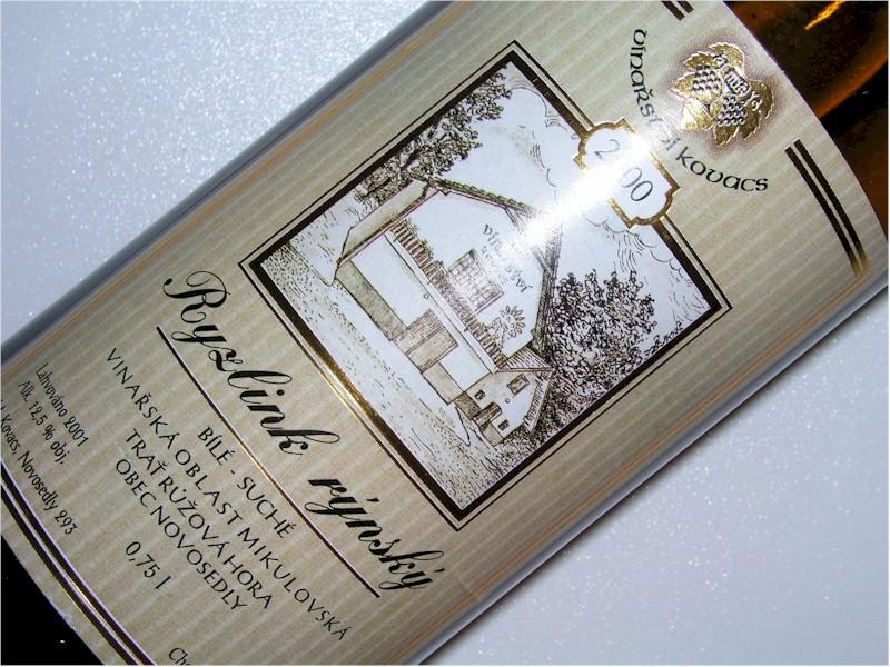 Poprvé se dostáváme k rodinné vinařské firmě s letitou tradicí - Vinařství Kovacs z Novosedel. Kapacita sklepního hospodářství dosahuje 350 tisíc litrů, čímž se řadí mezi středně velké firmy. Hrozny zpracovávají především z obcí Dolní Dunajovice, Březí, Mikulov a Novosedly ležící v Mikulovské vinařské oblasti a Božice ze Znojemské oblasti. V Novosedlích je tradiční tzv. dřevěný sklep pro ochutnávky s posezením. Ležácký sklep je v obci Brod nad Dyjí. Podívejme se na láhev Ryzlink rýnský ročník 2000 pozdní sběr z Mikulovské vinařské oblasti.Láhev typu „alsaská flétna“ má objem 0,75 l (hnědé sklo) a je opatřena lisovaným korkem. Barva je světle zelenožlutá. Vůně je hluboká a přechází od akátového květu k ovocným tónům (ananas, meruňky a další citrusové plody). Chuť je středně dlouhá s pikantní kyselinkou v dozvuku. Víno má velmi dobré předpoklady pro dlouhodobou archivaci. Můžete ho podávat k výraznějším úpravám sladkovodních a mořských ryb. Je také vhodné ke kozím sýrům s bílou plísní (Bougon), sýrům typu Trapist, Mondser, Reblochon, Munster a sýrům holandského typu s kořením. Tento Ryzlink rýnský má poměrně zvláštní odrůdové vlastnosti a je vhodný pro degustaci, kdy můžete porovnávat mezi ostatními ryzlinky např. z Bzenecké či Kyjovské vinařské oblasti. Produkce vinařské firmy Kovacs je velmi zajímavá a určitě se k ní v budoucnu vrátíme.