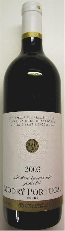 Odrůda: Modrý PortugalRočník: 2003Jakost: odrůdové jakostníCukernatost: suchéVinařská oblast: ZnojemskáVinařská obec: ChvaloviceViniční trať: Dívčí horaObsah zbytkového cukru g/l: 3,8Obsah kyselin g/l: 5,1Bezcukernatý extrakt g/l: 25,4Výrobce: Znovín Znojmo a.s.Alkohol: 11,3 % obj.Číslo šarže: 212Teplota podávání: 16 - 18º CDoporučená archivace: 2 - 3 rokyRok lahvování: 2004Cena: 87,- Kč (akční cena Globus v roce 2004)