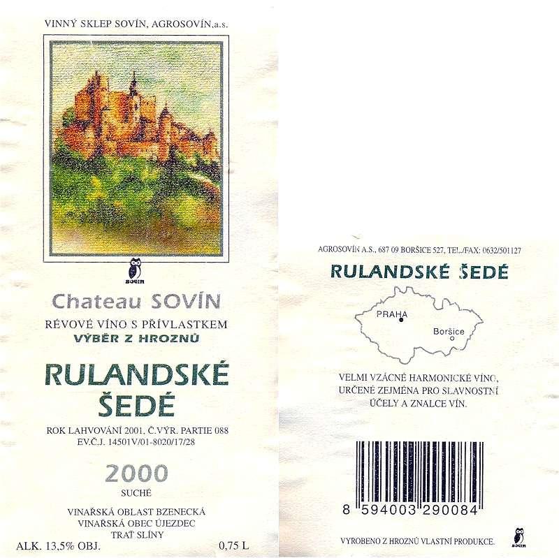 Shrnutí údajů o dnešním víně:Odrůda: Rulandské šedéRočník: 2000Jakost: výběr z hroznůZatřídění dle zbytkového cukru: suchéVinařská oblast: BzeneckáVinařská obec: ÚjezdecViniční trať: SlínyVýrobce: Agrosovín Boršice a.s.Alkohol: 13,5 % obj.Číslo výrobní partie: 088Evidenční číslo jakosti: 14501V/01-8020/17Rok lahvování: 2001Způsob odlepení etikety: láhev ponořit do horké vodyCena: 170,- Kč (přímo od výrobce v roce 2003)
