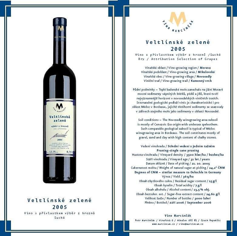 Shrnutí údajů o dnešním víně:Odrůda: Veltlínské zelenéRočník: 2005Jakost: výběr z hroznůZatřídění dle zbytkového cukru: polosladkéVinařská oblast: MoravaVinařská podoblast: MikulovskáVinařská obec: NovosedlyViniční trať: Kamenný vrchVýrobce: Víno Marcinčák MikulovČíslo šarže: 8/2/05Evidenční číslo jakosti: 20D1-06Číslo vzorku: 3Typ půdy: Teplé badenské moře zanechalo na jižní Moravě mocné sedimenty vápnitých štěrků, písků a jílů, které tvoří nejvýznamnější horizont v novosedelských viničních tratích. Srovnatelné geologické podloží vinic je charakteristické i pro oblast Médoc v Bordeaux, jejichž třetihorní sedimenty se usazovaly v zálivech stejného moře jako sedimenty v oblasti Novosedel.Vedení vinohradu: střední vedení s jedním tažněmHustota vinohradu: 3500 hlav/haStáří vinohradu: 28 letDatum sklizně: 21. října 2005Cukernatost moštu: 24,2 °ČNMVýnos/ha: 36 q/haObsah zbytkového cukru: 15 g/lObsah kyselin: 7 g/lObsah alkoholu: 13,50 % obj.Bezcukerný extrakt: 24,60 g/lVelikost partie: 3000 lahvíTeplota podávání: 9 - 11 °CTeplota skladování: 10 - 12 °CDoporučené pokrmy: ke studeným předkrmům, rybám a bílému masuPlněno: září 2006Získaná ocenění: zlatá medaile Šampioni MikulovskaZpůsob odlepení etikety: láhev vložit na 5 min. do horkovzdušné trouby při teplotě 180 °CCena: 210,- Kč u výrobce, e-shop