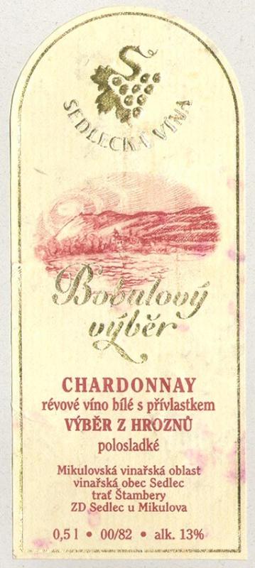 Shrnutí údajů o dnešním víně:Odrůda: ChardonnayRočník: 1999Jakost: Výběr z hroznů "Bobulový výběr"Zbytkový cukr: 17 g/l = polosladkéVinařská oblast: MikulovskáVinařská obec: SedlecTrať: ŠtamberyVýrobce: ZD Sedlec u MikulovaČíslo šarže: 00/82Evidenční číslo jakosti: na to si v roce 1999 ještě nehrajem :-)Cukernatost hroznů: 27,2° NMAlkohol: 13 % obj.Teplota podávání: 10 - 12 ºCTeplota skladování: do 12 ºC, hlavně stálá!Doporučená archivace: neuvedeno - pokud tuto láhev ještě máte, pijte ji hnedZpůsob odlepení viněty: na 5 min do rozehřáté troubyCena: ? Kč - bohužel, to odnesl čas