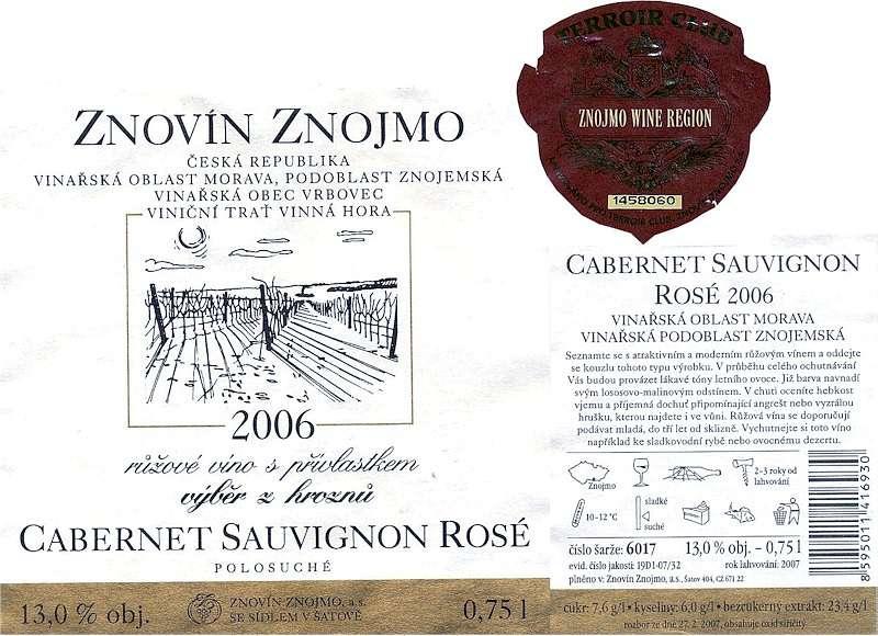 Shrnutí údajů o dnešním víně:Odrůda: Cabernet SauvignonRočník: 2006Jakost: výběr z hroznůKategorizace: roséZatřídění dle zbytkového cukru: polosuchéVinařská oblast: MoravaVinařská podoblast: ZnojemskáVinařská obec: VrbovecViniční trať: Vinná horaVýrobce: Znovín Znojmo a.s.Alkohol: 13,0 % obj.Číslo šarže: 6017Evidenční číslo jakosti: 19D1-07Číslo vzorku: 32Obsah zbytkového cukru: 7,6 g/lObsah kyselin: 6,0 g/lBezcukerný extrakt: 23,4 g/lCukernatost hroznů: 25,0 °NMDatum sklizně: 6. listopadu 2006Rok lahvování: 2007Výsadba révy vinné: 1995Způsob vedení révy: vysokéTyp půdy: druh půdy - písčito-hlinitá, struktura půdy - mírně štěrkovitá, 10 % skeletu, geologický původ - štěrkopísková terasa s mělkou spraší, hlinité sedimenty Karpatské předhlubněTechnologie výroby: odzrnění, okamžité lisování, kvašení v tanku bez možnosti regulace teploty, bez odbourání kyseliny jablečné, školení, plnění do lahvíDoporučená archivace: 2008 - 2009Teplota podávání: 10 - 12 °CTeplota skladování: 6 - 13 °CVelikost šarže: 3.900 lahví 0,75 LZpůsob odlepení etikety: lahev ponořit do horké vodyCena: 135,- Kč (přímo od výrobce přes Katalog služeb v srpnu 2007)