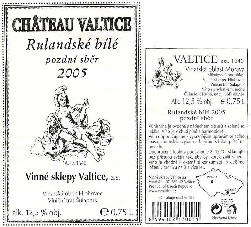 Shrnutí údajů o dnešním víně:Odrůda: Rulandské bíléRočník: 2005Jakost: pozdní sběrZatřídění dle zbytkového cukru: suchéVinařská oblast: MoravaVinařská podoblast: MikulovskáVinařská obec: HlohovecViniční trať: ŠulaperkVýrobce: Vinné sklepy Valtice, a.s.Alkohol: 12,5 % obj.Číslo šarže: 810/06Evidenční číslo jakosti: 96F1-06Číslo vzorku: 24Obsah zbytkového cukru: 5,4 g/lObsah kyselin: 6,6 g/lBezcukerný extrakt: 20,4 g/lDatum sklizně: 13. až 15. října 2005Cukernatost hroznů: 21,0 °NMStáří révy: cca v roce 1980Způsob vedení révy: vysokéTyp půdy: štěrkovitá s kamenyTechnologie výroby: řízená fermentaceRok lahvování: 2007Doporučená archivace: 2010Velikost šarže: 10.000 litrůTeplota skladování: 6 - 13 °CTeplota podávání: 9 - 12 °COcenění: Bronzová medaile Muvina PrešovZpůsob odlepení etikety: lahev ponořit do horké vodyCena: 139,- Kč (akce Globus v květnu 2008 nebo 150,- Kč v e-shopu vinařství)