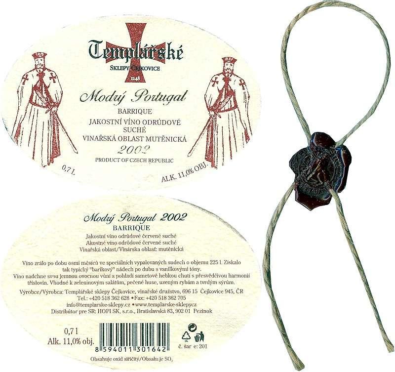 Shrnutí údajů o dnešním víně:Odrůda: Modrý PortugalRočník: 2002Jakost: odrůdové jakostníKategorizace: barriqueZatřídění dle zbytkového cukru: suchéVinařská oblast: MutěnickáVinařská obec: neuvedenoViniční trať: neuvedenoVýrobce: Templářské sklepy ČejkoviceČíslo šarže: 201Alkohol: 11,0 % obj.Doporučená archivace: odhaduji 2008 - 2010Způsob odlepení etikety: lahev ponořit do horké vodyCena: 239,- Kč (Hypernova v září 2008)