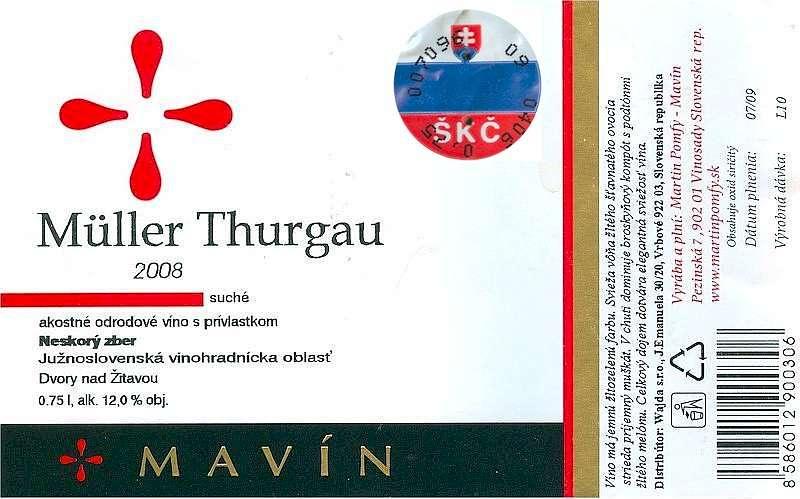V Tescu se během roku 2009 poprvé objevily dvě lahve slovenského vinařství Martina Pomfyho - Mavín. Cena za lahev byla vždy přes 200,- Kč, možná díky několika ocenění. Čekal jsem, zda se obě vína neobjeví v nějaké akci. To se stalo koncem ledna 2010 a tak kupuji Müller-Thurgau 2008 neskorý zber (pozdní sběr) (159,90 Kč, původní cena 229,- Kč) a Frankovku 2008 výber z hrozna (výběr z hroznů) (179,90 Kč, původní cena 279,- Kč).