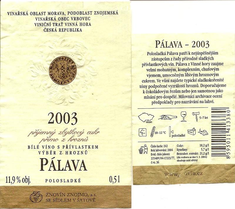 Shrnutí údajů o dnešním víně:Odrůda: PálavaRočník: 2003Jakost: výběr z hroznůZatřídění dle zbytkového cukru: polosladkéVinařská oblast: MoravaVinařská podoblast: ZnojemskáVinařská obec: Vrbovec Viniční trať: Vinná horaVýrobce: Znovín a.s.Alkohol: 11,9 % obj.Zbytkový cukr: 18,2 g/lObsah Kyselin: 5,7 g/lBezcukerný extrakt: 21,2 g/lČíslo šarže: 242Doporučená archivace: 2007-2010Teplota podávání: 9 - 12 °CTeplota skladování: 10 - 15 °CCena: 150,- Kč (II.Q 2005)