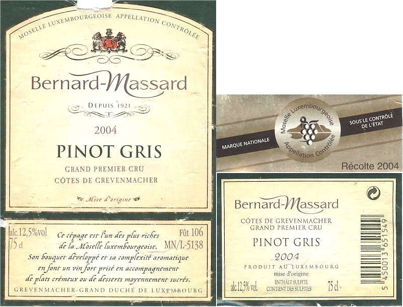 Shrnutí údajů o dnešním víně:Odrůda: Pinot GrisRočník: 2004Jakost: Moselle Luxembourgeoise Appellation ContrôléeKategorizace: Grand Premier CruObsah zbytkového cukru: suchéVinařská oblast: Moselle Luxembourgeoise (Lucemburská Mosela)Vinařská podoblast: Côtes de GrevenmacherVýrobce: Bernard-Massard, LucemburskoAlkohol: 12,5 % obj.Číslo šarže: MN/L-5138Doporučená archivace: 2011 - 2012Teplota podávání: 10 - 12 ºCZpůsob odlepení etikety: lahev ponořit do horké vodyCena: 730,- Kč (přímo od českého dovozce v říjnu 2006)