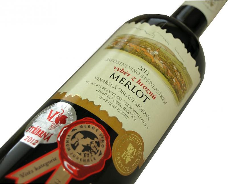Suchý Merlot 2011 výběr z hroznů jsem kupoval v září 2012 za 130,- Kč v 1. olomoucké vinotéce. A protože jsme zatím nezveřejnili žádnou recenzi na toto známé rakvické vinařství, uvedu nejprve základní informace, které přebírám z webových stránek. Vinařství bylo založeno v roce 1994 za účelem pěstování révy vinné a následné výroby a prodeje vín. Cílem bylo vyrábět vína vysoké kvality v menších šaržích. Vinařství obhospodařuje cca 20 ha vinic, ve kterých probíhá postupná obnova přestárlých vinic a kde se zároveň obměňuje odrůdová skladba podle našeho dlouhodobého záměru. V katastru obce Rakvice se nachází viniční tratě s názvy Kozí horky, Krefty a Trkmansko. Tyto tratě jsou především orientovány jižně nebo jihozápadně a proto dávají dobrou základnu pro výrobu těch nejkvalitnějších vín. Naše firma se zaměřuje na pěstování následujících odrůd: Veltlínské zelené, Pálava, Müller-Thurgau, Muškát moravský, Neburské, Ryzlink rýnský, Ryzlink vlašský, Sauvignon, Rulandské šedé, Tramín červený, Modrý Portugal, Svatovavřinecké, Frankovka, Cabernet Moravia, Zweigeltrebe a André. Mezi dvě nejvíce oblíbené bílé odrůdy z našeho vinařství patří Veltlínské zelené a Pálava, které jsou nejvíce zastoupeny v našich vinicích. Z červených odrůd jsou nejvíce oblíbeny Cabernet Moravia a Frankovka pro svou intenzívní barvu a mohutnou chuť. Prvořadá pozornost je věnována jarnímu řezu vinice a následným zeleným pracím tak, aby spolu s cílenou agrotechnikou bylo možné získávat prvotřídní surovinu pro výrobu jakostních a přívlastkových vín. Na vinicích provádíme redukci násady, aby byl docílen maximální výnos z jednoho keře 2 až 2,5 kg hroznů podle odrůdy, jenž zaručí dobrou vyzrálost hroznů a kvalitu budoucího vína. Naše vinice jsou obhospodařovány v ekologicky přijatelném systému integrované produkce.