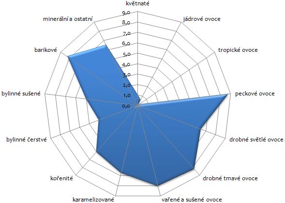 Barva je višňově červená, má velmi dobrou intenzitu a také viskozitu. Vůně je poměrně těžká a široká zároveň. Jsou zde ovocité tóny v nástupu, které připomínají třešně a peckové ovoce. Vše se přesouvá do slabých animálních a kořenitých tónů. Můžete také najít domácí zavařeninu nebo marmeládu z lesních plodů, kůži či selský dvoreček. Struktura buketu je široká a během popíjení nabízela zajímavé dimenze. U poslední skleničky byly docela výrazné tóny sušených višní a hořká čokoláda.