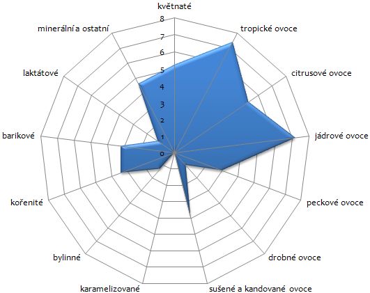 Barva je zlato-žlutá, má střední intenzitu a krásnou jiskru. Viskozita odpovídá přívlastku a zatřídění podle zbytkového cukru. Vůně má ovocitý nástup, ve kterém můžete najít tóny máslových hrušek, které se přesunou do vyzrálých hroznů.