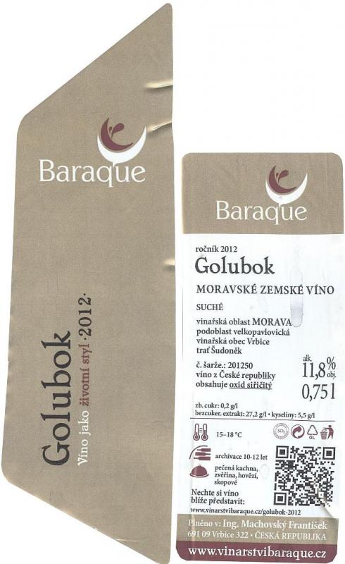 Shrnutí údajů o dnešním víně:Odrůda: GolubokRočník: 2012Jakost: zemskéZatřídění dle zbytkového cukru: suchéVinařská oblast: MoravaVinařská podoblast: VelkopavlovickáVinařská obec: VrbiceViniční trať: Krátký - ŠudoněkVýrobce: Vinařství Baraque VrbiceAlkohol: 11,8 % obj.Číslo šarže: 201250Obsah zbytkového cukru: 0,2 g/lObsah kyselin: 5,5 g/lBezcukerný extrakt: 27,2 g/lDatum sklizně: 25. října 2012Cukernatost hroznů: 21,4 °NMVýsadba révy proběhla v roce: 2000Způsob vedení révy: středníTyp půdy: černozemVelikost šarže: 300 lahvíDostupnost lahví v červnu 2015: 270 ksDoporučená archivace: 10 - 12 letTeplota skladování: 6 - 15 ºCTeplota podávání: 15 - 18 ºCZpůsob odlepení etikety: lahev vložit na 5 min. do horkovzdušné trouby na 180 °CCena: 290,- Kč (přímo ve vinařství v červnu 2015)