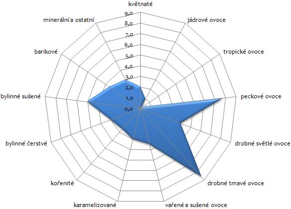 Barva je naprosto neuvěřitelná z pohledu odstínu a intenzity, takže je inkoustově černá, pouze při pohledu přímo do světelného zdroje najdete na okrajích fialové záblesky. Také viskozita je vysoká a přesvědčivá. Vůně je hluboká a pro mne opět naprosto netypická a zvláštní. V nástupu najdete těžké tóny černého rybízu, které přechází do sušených višní a brusinek. Na pozadí se objevují odstíny hořké čokolády, švestková povidla a kávová zrna. Když to všechno srovnám s popisem u tohoto vína na webových stránkách, musím s textem naprosto souhlasit. Buket má bohatou strukturu a postupně nabízel velmi zajímavé dimenze.