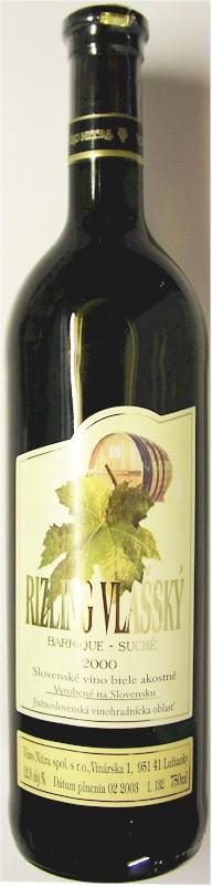 Ryzlink vlašský patří mezi nejvíce rozšířené odrůdy na Slovensku (zde nazývaný Rizling vlašský) a najdete ho ve všech vinařských oblastech. Podíváme se na láhev Rizling vlašský ročník 2000 odrůdové jakostní v bariku ze společnosti Víno Nitra. Víno má původ v Južnoslovenské vinařské oblasti. Musím se přiznat, že Ryzlink vlašský jsem ještě v bariku neviděl a u nás se prakticky pro tuto technologii nepoužívá. Platí totiž zásada, že jen z kvalitního vína s dobrým extraktem a potenciálem lze vyrobit kvalitní barikové víno. Takže jsem byl nesmírně zvědavý, jak si tento rizling povede.