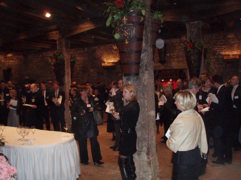Mezitím v hlavním stanu, za účasti starosty, prezidenta místní společnosti Svatého Vincenta, členů Bratrstva rytířů Chevaliers du Tastevin a zdejších vinařů, probíhá hostina Banquet des Vignerons. Ten kdo zhlédl film "Velká žranice" si jistě dovede představit o co zde kráčí. Za tuto výsadu je sice ovšem nutné tučně zaplatit, ale stojí to za to. Letošní menu, ke kterému se podávala vína zvučných jmen z okolí Nuits-Saint-Georges, Champagne a Cognac, mělo sedm chodů: od šnečí terriny na bylinkové omáčce, přes ústřice, humry a další dary moře, křepelky nadívané husími játry foie gras, steaku z býčka Charolais, saláty a sýry až po závěrečný croustillant chocolat au nougat glacé avec son coulis aux fruits rouges. Takové hodování sice zabere celé odpoledne, ale přesto po jejím skončení zbývá dost času na taneční zábavu za doprovodu orchestru Les Joyeux Bourguignons.