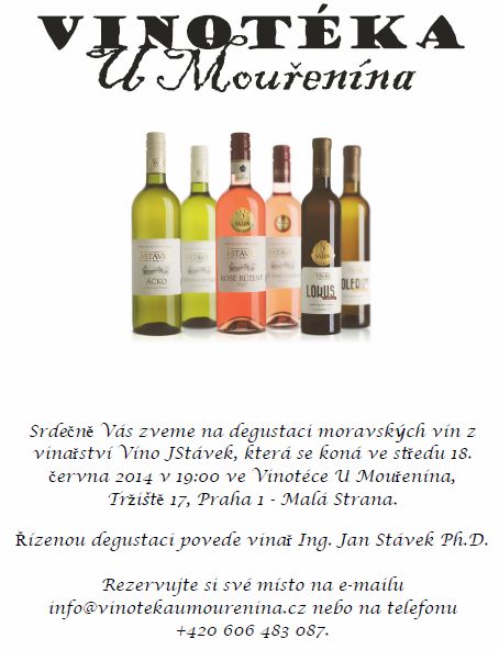 Srdečně Vás zveme na degustaci moravských vín z vinařství Víno JStávek, která se koná ve středu 18. června 2014 v 19:00 hod. ve Vinotéce U Mouřenína, Tržiště 17, Praha 1 - Malá Strana. Řízenou degustaci povede vinař Ing. Jan Stávek Ph.D.