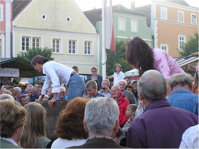 Pod radniční věží je tribuna, kde se zpívá, tancuje a je různý program po celé tři dny (pátek - neděle). Například soutěž žen či dívek ve šlapání hroznů ve dvou velkých kádích - kdo rychleji a kvalitněji. Po pečlivém odměření šťávy za obrovského jásotu a povzbuzování okolostojících vyhrává dívka v růžovém... Pod tribunou mezi dvěmi reklamními sloupy s nápisem Weinviertel DAC se zdarma nalévalo Veltlínské zelené DAC (Weingut Hindler) z 15 a 18 litrových lahví pomocí důmyslného strojku. Lahve svojí velikostí patří mezi největší v Rakousku, možná i za jeho hranicemi. Každý si mohl nechat nalít kolik chtěl, žádné tlačenice, naprosto volný pohodlný průběh. Stejně jako víno tekoucí z obou kašen po celé nedělní odpoledne - z jedné Modrý Portugal (Weingut Hebenstreit) a z druhé Veltínské zelené bylo volně k dispozici všem, žádné fronty, prostě pohoda. A tak opravdový milovník či znalec vína má v Retzu na vinobraní možnost ochutnat tolik kvalitního lahvového vína, že by jindy musel najezdit desítky kilometrů, aby obejel všechny výrobce v okolí. Navíc jeden ze srubů byl věnován Salonu vín Rakouska - v němž byla špičková vína výrobců z Retzerlandu, kteří se kvalitou vín do salonu prosadili (Weingut Bannert vínem Weinviertel DAC 2004, Zweigelt Reserve 2003, Weingut Bauer vínem Schatzberg Cuvée 2000, Weingut Hofbauer vínem Cabernet Sauvignon 2003, Weingut Klein vínem Chardonnay Barrique 2003, Weingut Koller vítězem salonu Weissburgunder 2004, Weingut Berger vínem Grüner Veltiner Selection 2004, Weingut Binder Beerenauslese 2003, Weingut Gruber vínem Sauvignon blanc 2004, Weingut Gschweicher vínem Grüner Veltliner 2004, Weingut Hebenstreit vínem Welschriesling 2004, Weingut Hindler vínem Chardonnay 2004, Landesweingut Hollabrunn vítezným vínem Eiswein Traminer 2002, Weingut Lehner vínem Neuburg 2004, Weingut Lutzer vínem Weinviertel DAC 2004, Weingut Schüfmann vínem St. Laurent Reserve 2002, Winzerhof Stift vínem Gelber Muskateller 2004, Blauer Portugieser Cuvée 2003, Rosé vom Cabernet Sauvignon 2004, Weingut Manhart vínem Zweigelt General 2003, Weingut Nebenführ vínem Cabernet franc 2003, Weingut Pollerhof vínem Churchhill Cuvée 2003, Weingut Prechtl vínem Riesling 2004, Weingut Schneider vínem Grüner Veltliner 2004 a Weingut Schöfmann vínem Baluburger 2003). Jistě uznáte, že zastoupení docela reprezentativní. Ale i ostatní vinaři ve stáncích předváděli to nejlepší ze své produkce. Cena 1/8 vína se pohybovala od 0,90 po 5 € podle kvality, ročníku ale i získaných ocenění. Ovšem komu se cena zdála velká či měl už hlouběji do kapsy, šel si prostě ke kašnám načepovat zadarmo a kolik chtěl...