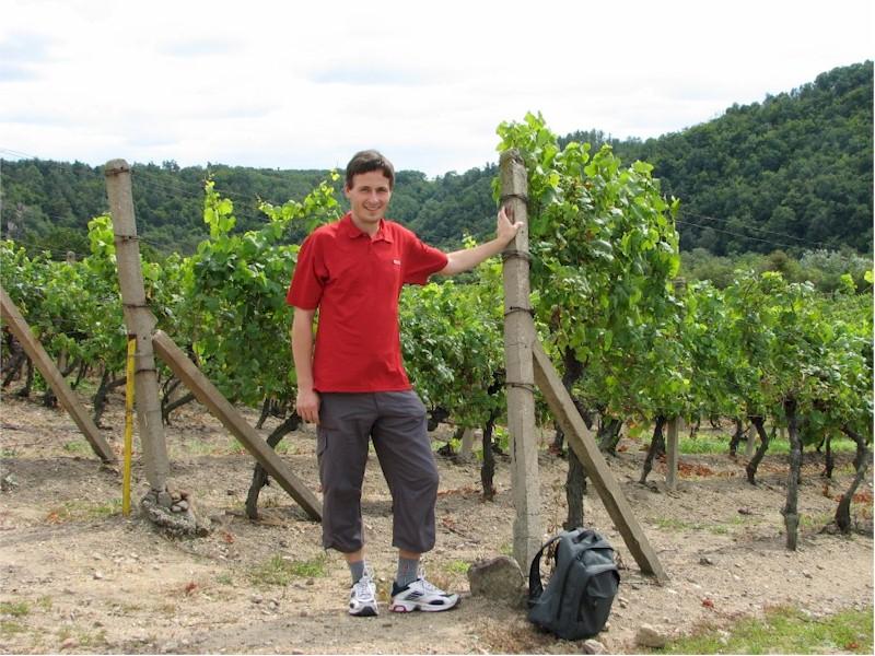 První skutečně vinařskou zastávkou toho dne bylo Vinařství Kovacs s.r.o., Novosedly. Byli jsme zde velmi spokojeni. Nejenže nám paní nabídla bez rozpaků jakékoliv víno k ochutnávce, naopak ještě nám další přidávala:-) Toto vinařství má v nabídce převážně bílá vína, nám se nejvíce zamlouvalo cuveé odrůd Tramín červený a Ryzlink rýnský a překrásným buketem nás ohromil šampion mladých vín 2005 Muškát moravský. Ale všechna představená vína byla kvalitní za velmi solidní ceny a moc se nám líbila firemní krabice pro nakoupené lahve. Prostě ukázkový přístup ve všem, kdyby to takto vypadalo na celé Moravě, byli bychom mnohem dál. Spokojení jsme se vydali do Mikulova, kde mělo být sídlo firmy Mikrosvín v ulici Nádražní. Zde jsme ovšem našli jen bytovky a tak jsme se naslepo vydali do Dolních Dunajovic, kde jsme už byli o mnoho úspěšnější, ale proč firma všude uvádí svojí mikulovskou adresu nechápu. V Dunajovicích jsme podle informačních cedulí vcelku dobře našli ve vinicích ležící degustační místnost Mikrosvínu a po cestě k ní nás minulo několik velmi „rozjařených" cyklistů, věděli jsme, že jsme na dobré stopě :-) Přímo v degustační místnosti jsme nalezli sommeliera, který právě sklízel sklenice po návštěvě cyklistů a upřímně se divil, že do nás nenabourali. Nakoupili jsme si několik vín z omezené nabídky. Protože, jak nám bylo sděleno prodejna funguje pouze v pracovní dny a to ještě jen do 3 hodin odpoledne, což je u tak velké firmy dost zarážející a podle mě nedostatečné. I když je mi jasné, že svoje vína prodají i tak. Ceny jsou však už minimálně o třídu vyšší než u předchozího vinařství, i když stále řekněme přijatelné. Z tohoto místa je překrásný výhled na celou Pálavu a tak náš cíl byl jasný. Vyšplháme se k vinici Železné a možná ještě výš. Vzpomenu také na MiBiTovou reportáž Po vinicích Vinařství Mikrosvín Mikulov, a.s.. Vrátili jsme se zpátky Dunajovicemi a hlavní křižovatku jsme projeli rovně na mou oblíbenou obec Pernou. Zde jsme se dali doleva, kus ještě autem a pak už jsme stoupali vzhůru mezi řadami vinic. Na jednom místě jsme narazili na výsadbu stolních odrůd, dokonce i s informační tabulí. Hrozny odrůdy Arkadia jsou skutečně nádherné a nebylo by asi špatné, kdyby se tyto odrůdy pěstovaly ve větším měřítku a daly se koupit, třeba alespoň u vinařů současně s burčákem.