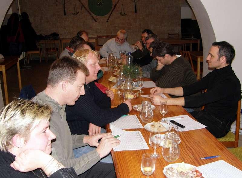 Sešli se tu někteří pozvaní vinaři z Prosiměřic, Vítonic, Horních Dunajovic, Lechovic a Práčí, aby přechutnali, ohodnotili a hlavně si popovídali o svých vínech, vůbec o vinařství a všeho kolem. V příjemné vinárně bylo na barovém pultu vyrovnaných 36 vzorků 18 odrůd převážně bílých vín. Většinou to byla mladá vína ročníku 2008 případně 2007, což bylo dopředu domluvené. Slova se ujal Pavel Dohnal z Lechovic se vzpomínkou na nedávno zesnulého Jana Kuřitky. Rozdali se velké degustační listy s tím, že se bude ochutnávat naslepo bez udání výrobce a po každém šestém vzorku se provede otevřená diskuse a odtajnění vinařů, aby individuální hodnocení nás všech bylo objektivní a bez jakýchkoliv zábran. Poté syn Libor (kdo jezdí na putování se Znovínem jej jistě znají) a otec Josef Tvarůžek (vinohradník Lahoferu) z Prosiměřic veřejně ohodnotili první vzorek pro srovnání měřítek a poté následovalo vlastní individuální ochutnávání. Bylo navrženo hodnocení podle pětibodové stupnice. Vše probíhalo v klidu a naprosto profesionálně, jako na nějaké velké významné soutěži. Vždy po šestém vzorku se rozproudila diskuse, vyhodnocení nejlepšího vzorku včetně vtipných poznámek v nichž vynikal zejména pan Hesina z Vítonic...