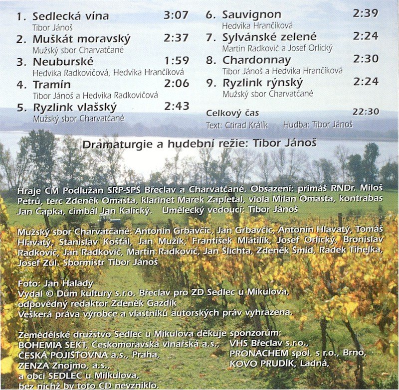 Vinařskou obec Sedlec, patřící do Mikulovské vinařské oblasti, najdete na cestě mezi Mikulovem a Valticemi. Výrobcem známých „Sedleckých vín" je zemědělské družstvo, které hospodaří na pozemcích nacházejících se v krásné moravské přírodě, chráněné krajinné oblasti Lednicko-Valtického areálu. Sídlo firmy najdete na břehu největšího moravského rybníku Nesyt. Vápencové podloží místních půd díky blízkosti Pálavských vrchů a zrcadlový efekt rybníku Nesyt stojí za kvalitou vyhlášených sedleckých viničních tratí. Koncem června tohoto roku proběhl křest originálního CD pod názvem Sedlecká vína, na kterém najdete 9 skladeb autorů Ctirada Králíka (text) a Tibora Jánoše (hudba). Všechny texty jsou orientovány na místní odrůdy révy vinné, jak naznačují názvy skladeb (Muškát moravský, Neuburské, Tramín červený a podobně). Autor textů je zároveň sklepmistr, takže není pochyb o autentičnosti skladeb.CD obsahuje texty všech skladeb a přiložená publikace nádherné kresby a charakteristiku vín výjimečného ročníku 2000 s originálním doslovem Prof. Viléma Krause. Toto CD, které můžete zakoupit přímo v Zemědělském družstvu, je velmi zajímavým počinem, který může zpříjemnit ochutnávání sedleckých vín a tuto oblast přiblížit široké veřejnosti.Název: Sedlecká vína (2003)Vydal: Dům kultury s.r.o. Břeclav pro ZD Sedlec u MikulovaHraje: CM Podlužan Břeclav a CharvatčanéCena: 99,- Kč