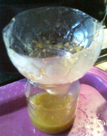 Ale vraťme se k marmeládě! Mohu potvrdit, že dobrou marmeládu je možno vyrobit z hroznů nejen přebytečných a nevzhledných, ale zcela nedozrálých, s bobulemi zelenými a tvrdými, popraskanými, dokonce i napadenými černěmi, moučnatkou, ba i hnilobou. Obzvlášť vhodné je zpracovat tak hrozny, kterým plíseň napadla třapinu, až zaschla, ale bobule zatím zůstaly zdravé, byť už nedozrají. Marmeláda je v každém případě chutnější než ty běžné z obchodu, pouze napadení oidiem chuť trochu kazí. Na obrázku 1) vidíte hrozny odrůdy Panonia Kincze, která po letošním dost suchém létě, při prvním dešti popraskala a začala hnít. Z hroznů je třeba otrhat bobule, ty dobře roztřídit, omýt a připravit ke zpracování. Zahrádkáři mají často vadných bobulí jen hrstku, pro kterou se nevyplatí špinit kuchyni, ale téměř každý den. V takovém případě lze omyté bobule hromadit v mrazničce, kde mohou čekat, až jich bude dost, případně se dají doplnit jiným ovocem, například jablky. Na obrázku 2) se ve velkém hrnci bobule vaří. Není třeba na začátku podlévat vodou a pak se jí pracně zbavovat vyvařením, stačí trochu bobulí rozmačkat. Varem bobule změknou, slupka změní barvu, dužina vytéká i pecičky se uvolňují. O slupky ani pecičky v marmeládě nestojíme, nejlépe se jich zbavíme v pasírce. Pasírka je ten bílý cedník s červenou kličkou, který má nožičky, aby dobře stál na hrnci. Každá kuchařka, která občas vaří svíčkovou, ji jistě zná. Hrnečkem či naběračkou ji naplníme rozvařenými bobulemi (viz obrázek 3), párkrát zatočíme a šnek protlačí vše měkké do podstaveného hrnce. Slupek a peciček (viz obrázek 4) se zbavíme nakloněním pasírky nad odpadní misku a zatočením v protisměru. Protože do malého hrnce pod pasírkou se nám jistě nevejde všechna budoucí marmeláda, průběžně ji odléváme do další nádoby. Získaná tekutina je na marmeládu stále příliš řídká. Vrátíme ji do hrnce, nemusíme všechnu, nejlépe aby hladina nebyla výše než tři centimetry (viz obrázek 5). Za stálého míchání ji zprudka vaříme, a odpaříme přebytečnou vodu. Můžeme přidat i želírovací přípravek, nemusí ho být moc, hrozny dobře želírují a čím méně jsou zralé, tím tužší marmeláda je. Přípravků je více druhů, nezaleží na tom, jaký koupíte, ale řiďte se návodem výrobce. Když se část vody odpaří, přidáme cukr. Naberte trošku na lžičku, nechte zchladnout, ochutnejte a řiďte se chutí. Do velkého hrnce přidáte nejspíš celé kilo, možná i víc. Zkušená kuchařka pozná kdy je hotovo podle záclonek, které dobře uvařená marmeláda dělá při odkapávání z vařečky. Kdo chce mít jistotu, vychladí si v ledničce malý talířek, maličko marmelády na něj kápne, nechá vychladnout a ztuhnout, a zkusí, zda je už dostatečně tuhá a dobrá. Horkou marmeládu je třeba dopravit do sklenek, pokud možno bez toho, abyste opařili rodinu, a znečistili kuchyň. Slíznout ukáplou kapku je dobrý nápad, jen pokud není horká a stá! Skleničky si proto připravte na nějaký omyvatelný tác, trychtýř z dvoulitrové PET lahve se také dobře osvědčil (viz obrázek 6). Já sklenky plnil horkou marmeládou a hned otáčel (viz obrázek 7), je možné je i doplnit kávovou lžičkou chuťově výrazného alkoholu a ihned zavřít (bez otáčení, vroucí alkohol vydesinfikuje prostor pod víčkem a pak i ochutí marmeláda), nebo je po uzavření ještě sterilizovat. Poslední sklenku jsem už neotáčel, protože tenká vrstvička marmelády na velikém hrnci sice naplní poslední sklenku (viz obrázek 8), ale než ji seškrábete, stačí vychladnout. S jednou sklenkou marmelády se přece nebudu sterilizovat! Strčil jsem ji do lednice, nepřežila hned příští palačinky! Hotová marmeláda trochu ztuhne hned po zchladnutí (viz obrázek 9), a během dalších dvou dnů ještě trochu. Z bílých hroznů nemá zrovna nejhezčí barvu, ale jistě oceníte dobrou chuť!