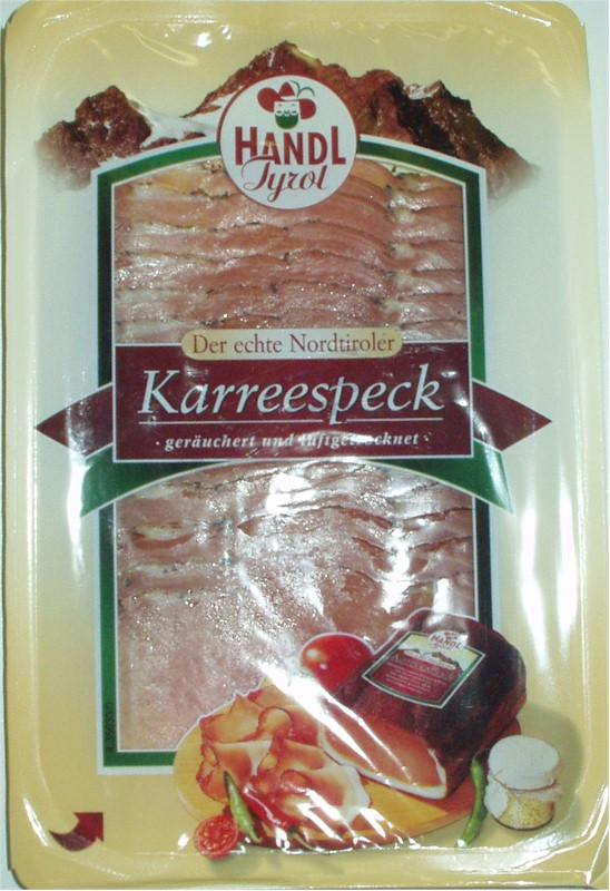 Podobně, jako jsme nedávno psali o Tyrolské šunce, je od stejného výrobce Tyrolské karé vyrobeno originální recepturou v Rakousku. Složení: uzené vepřové maso, dextroza, konzervační látky E250, E252, mořská sůl s jodem, koření. K tomuto karé se hodí výrazná vína např. Sauvignon, Muškát Ottonel, která mají vysoký obsah zbytkového cukru.Výrobce: Handl Tyrol, A-6551 Pians 33Dovozce: Dobro s.r.o., 5. května 278, MochovTeplota skladování: +2 až +7° CHmotnost: 80 gCena: 39,50 Kč (Globus v roce 2003)