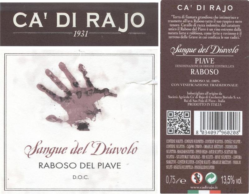Shrnutí údajů o dnešním víně: Obchodní název: Sangue del Diavolo Odrůdy: Raboso PiaveRočník: 2010 Jakost: Denominazione di Origine Controllata (DOC) Zatřídění dle zbytkového cukru: suché Vinařská oblast: Veneto Výrobce: Società Agricola Ca' di Rajo di Cecchetto Bortolo & S. s.s. P. Rai di San Polo di Piave, Itálie Alkohol: 13,5 % obj. Obsah zbytkového cukru: 6,0 g/l Obsah kyselin: 6,8 g/l Bezcukerný extrakt: 32,0 g/l Číslo šarže: L/200 Teplota podávání: 18 - 20 °C Doporučená archivace: 2015 - 2018 Způsob odlepení etikety: lahev vložit na 5 min. do horkovzdušné trouby na 180 °C Cena: cca 13,- € (přímo ve vinařství v lednu 2015)
