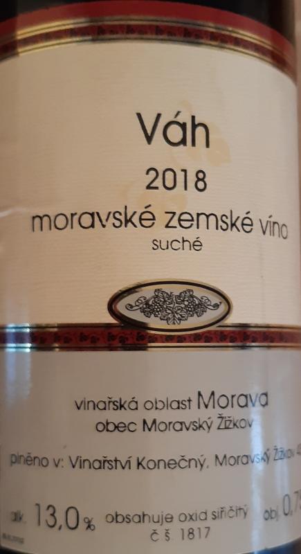 Váh 2018 zemské - Vinařství Konečný Moravský Žižkov. Zelená Bordo láhev, korek (plátek-drť-plátek 44 mm). Tmavý rubín, vysoká viskozita. Slabá ale příjemná vůně marmelády, tmavého ovoce a ostružin. Plné tělo, lahodné, sametové, v chuti borůvky, ostružiny, náznak vanilky a koňaku, delší dochuť. Dostalo lepších 7,5 (84) bodů.