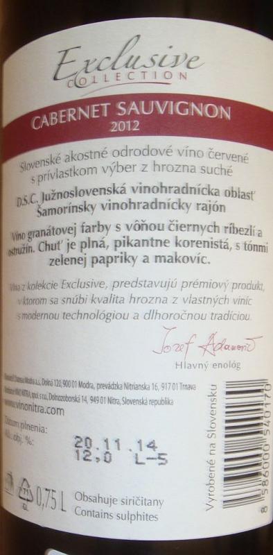 Cabernet Sauvignon 2012 výber z hrozna, D.S.C. - Víno Nitra. Exclusive Collection. Južnoslovenská vinohradnická oblast, Šamorínský vinohradnický rajón. Hnědá láhev Bordo Europea byla uzavřena plným korkem dlouhým 45 mm. Hezká rubínová barva, vysoká viskozita. Středně intenzivní příjemná vůně černého rybízu a máku. Plné tělo, poměrně pikantní, kořenité, s poněkud výraznějšími tříslovinami, ale velmi dobře pitelné. Dochuť delší. Ohodnotil jsem lepšími 7,5 (84) body.