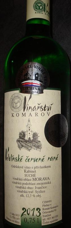 Veltlínské červené rané 2013 kabinet - Vinařství Komarov. Vinařská obec Ivančice, vinařská trať Syslice. Víno dostalo Stříbrnou medaili na mikulovských vinařských trzích. Zelená Bordo láhev byla uzavřena korkem z drti dlouhým 38 mm. Obsah alkoholu 12,7 %. Světlinká barva s šedozeleným nádechem, viskozita střední. Lehká vůně s nádechem medu a sladkých hrušek. Příjemná svěží chuť, jemně nasládlé (i když suché), s nepatrnou ale nerušící hořčinkou, lehce olejovité. V těle méně plné, velmi dobře pitelné, dochuť středně dlouhá. Dostalo lepších 7 (81) bodů.