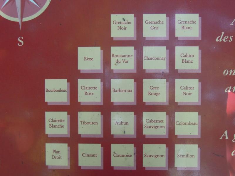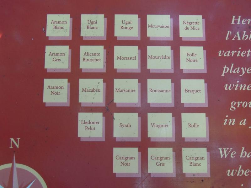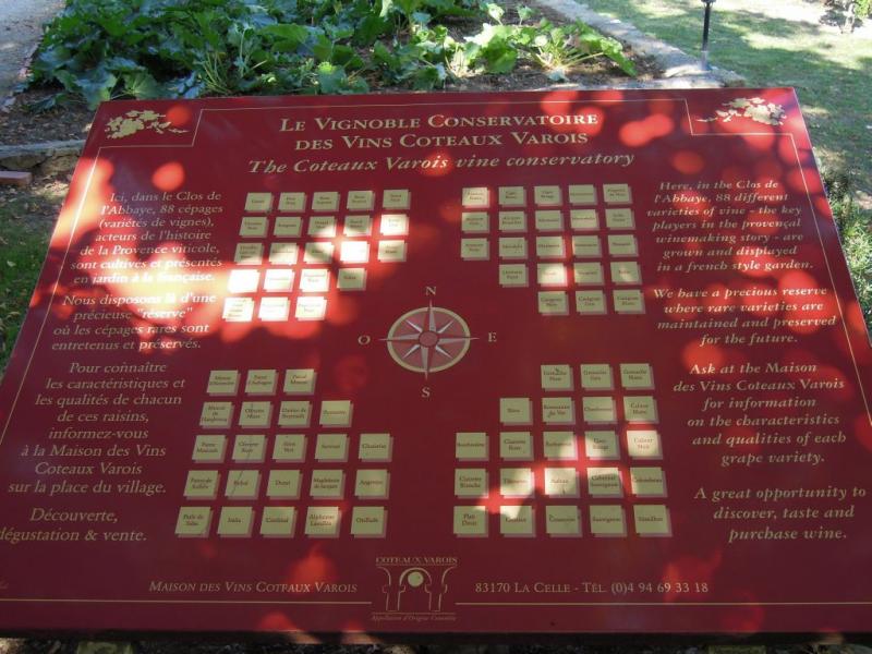 Ale zpět k Maison des Vins v La Celle. Leží v centru obce, v areálu bývalého kláštera, kde je také slavná michelinská restaurace Hostellerie de l'Abbaye de la Celle (web). My jsme šli nejdříve do někdejší klášterní zahrady, kde se nachází tzv. Conservatoire des cépages, něco jako botanická zahrada, v níž je v pravidelných útvarech vysázeno celkem 88 odrůd révy vinné, které se v Provence v minulosti i v současnosti pěstovaly resp. pěstují (jejich úplný seznam lze vyčíst z fotografií orientačního plánu zahrady).