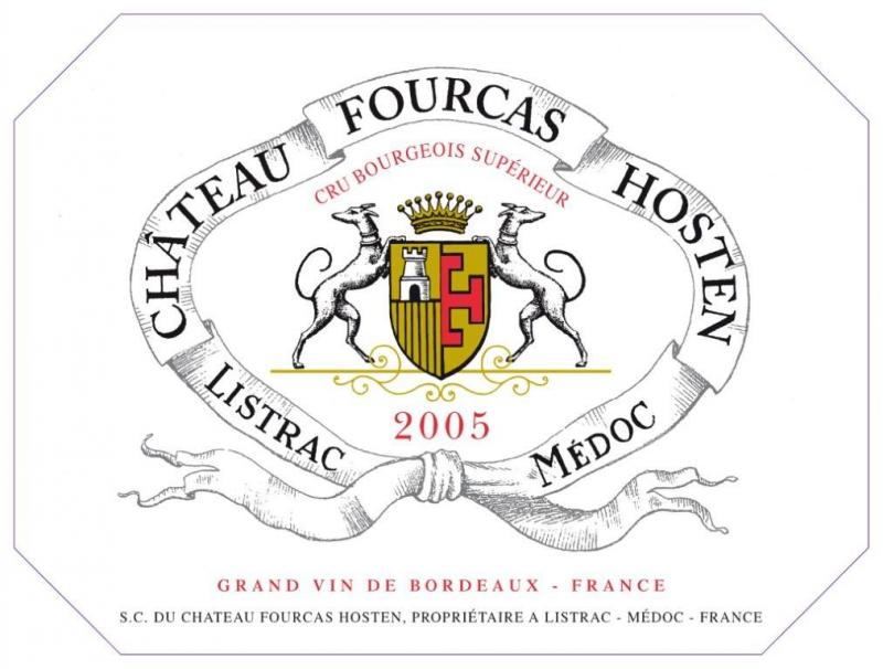 Château Fourcas Hosten 2005, Listrac-Médoc AOC, Listrac-Médoc. Jedno ze známějších vinařství (web) v apelaci Listrac na "levém břehu" v Bordeaux, 47 ha vinic, cru bourgeois supérieur v klasifikaci z roku 2003. Ročník 2005 je směs 53 % Cabernet Sauvignon a 47 % Merlot, výnos 58 hl/ha, školeno 22 měsíců v barikových sudech, z nichž třetina je nová.