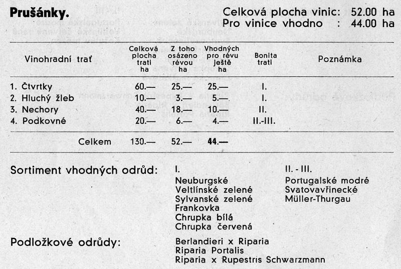 Tabulkově se Prušánky chlubily koncem roku 2007 394 registrovanými pěstiteli a téměř 188 ha registrovaných výsadeb (z celkové výměry tratí 274 ha). U obou čísel je ale od roku 2005 mírný pokles (dříve 400 pěstitelů a 190 ha). Zdejší tratě nevynikají nijak zvlášť výraznými svažitostmi. Nejlépe orientovanými ke slunci se zdají Nechory a hlavně Čtvrtky, u zbylých tratí se místy terén stáčí až k severovýchodu, ale při pozvolném sklonu to není tak fatální. V kategorizaci tratí Podkovné (v původních nesloučených hranicích), Úlehle, Titlovo a Újezd mají druhou kategorii, zbytek první.